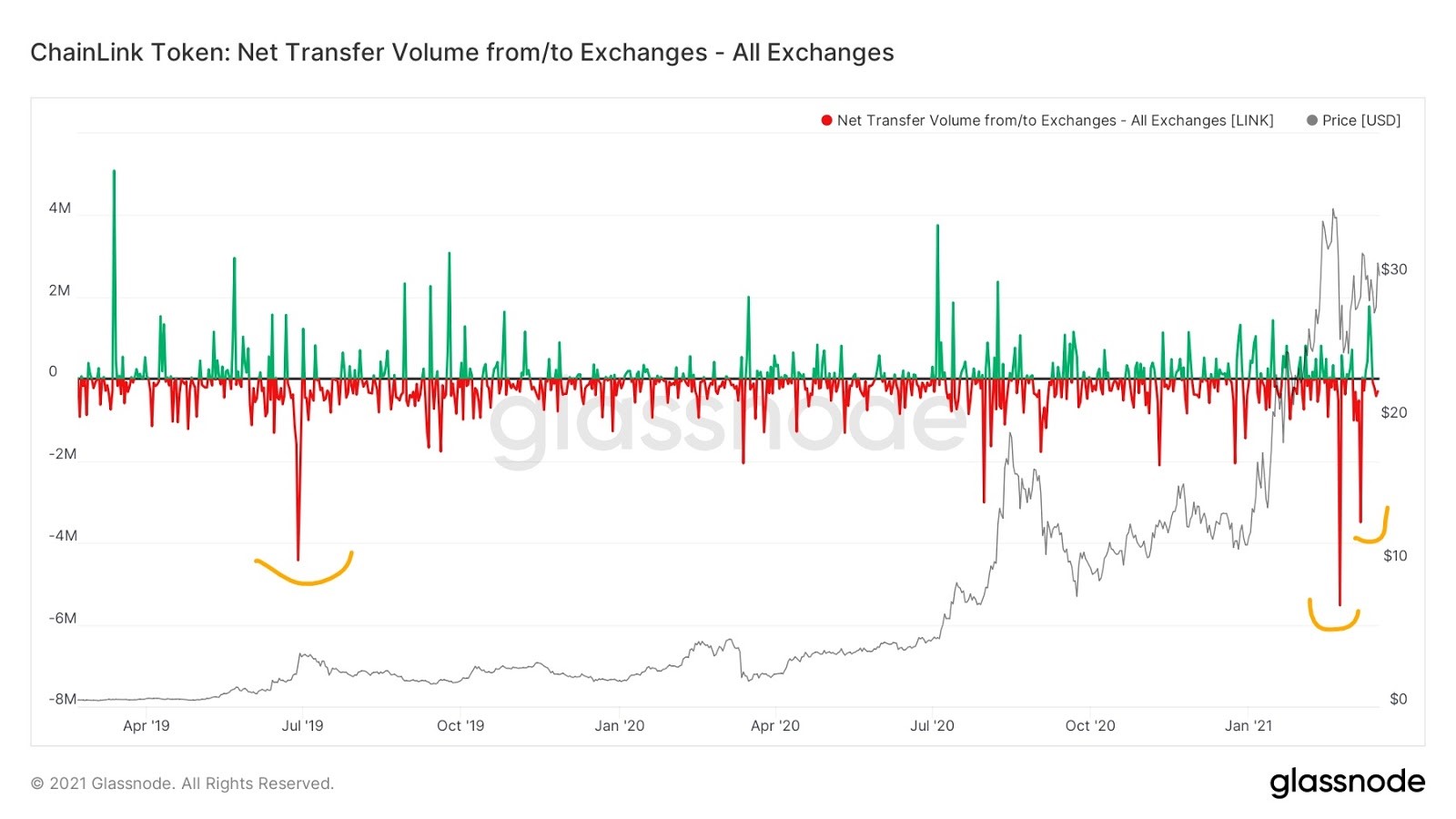 Ngoài ra, chỉ báo Khối lượng chuyển tiền ròng từ/đến sàn giao dịch xác nhận điều này. Trong những ngày gần đây, lượng LINK ra khỏi sàn cao kỷ lục. Vào ngày 23/2 và ngày 7/3, các đợt rút token lớn nhất và lớn thứ ba trong lịch sử của nó đã diễn ra.