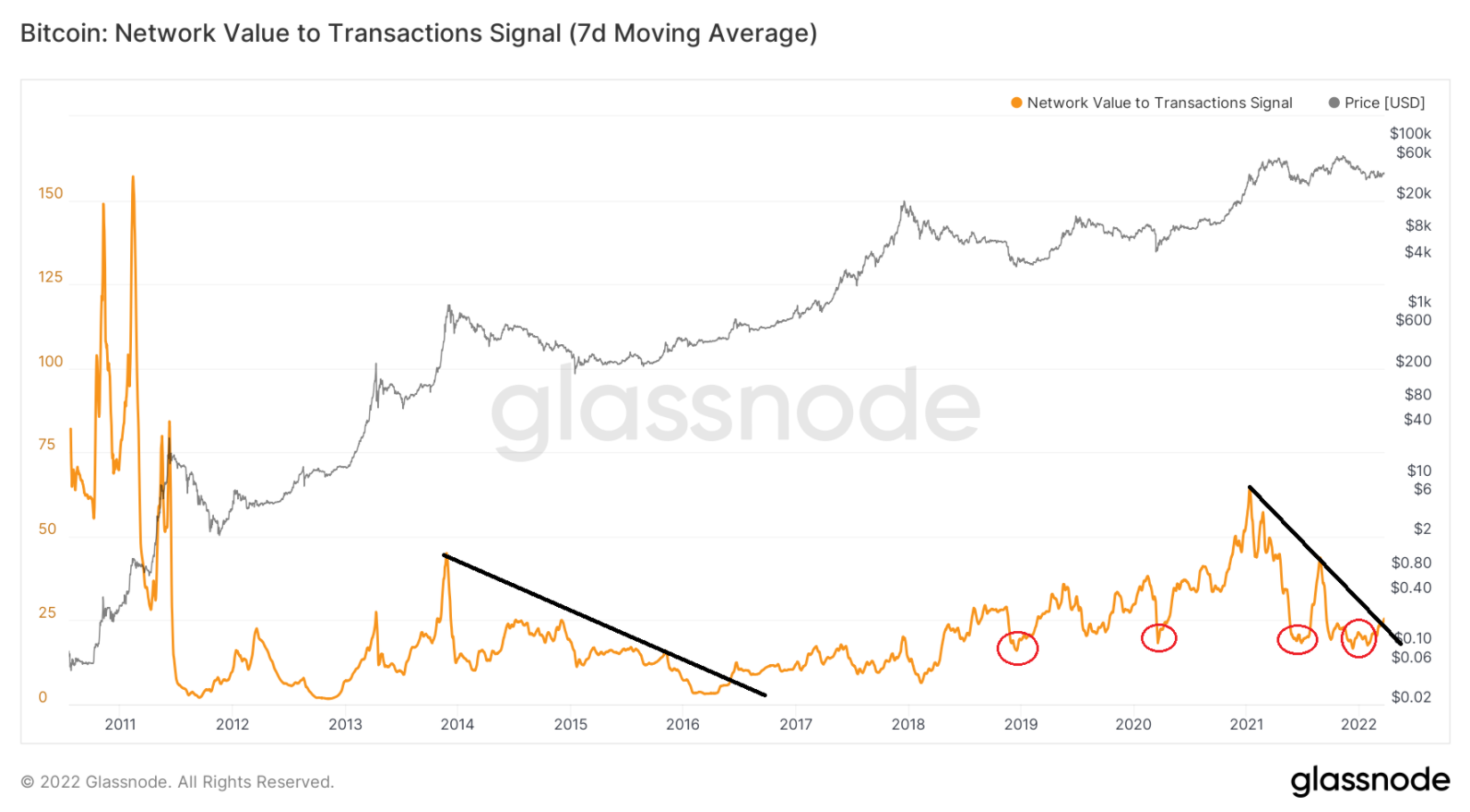 Giá trị cao là dấu hiệu của việc định giá quá cao, vì nó có nghĩa là sự gia tăng giá trị thị trường không được hỗ trợ bởi sự gia tăng trong khối lượng giao dịch on-chain. Tuy nhiên, trong khi các giá trị cao được coi là giảm giá, thì các giá trị thấp hơn không nhất thiết được coi là tăng giá. Vì mức đọc thấp có thể là do không có sự quan tâm nào trong mạng.