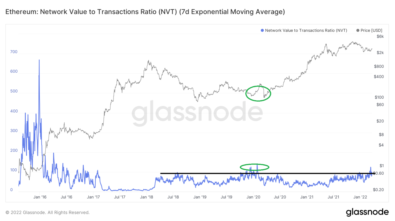 Trong trường hợp của Ethereum, NVT đã giao dịch dưới 90 (đường màu đen) trong phần lớn lịch sử của nó.