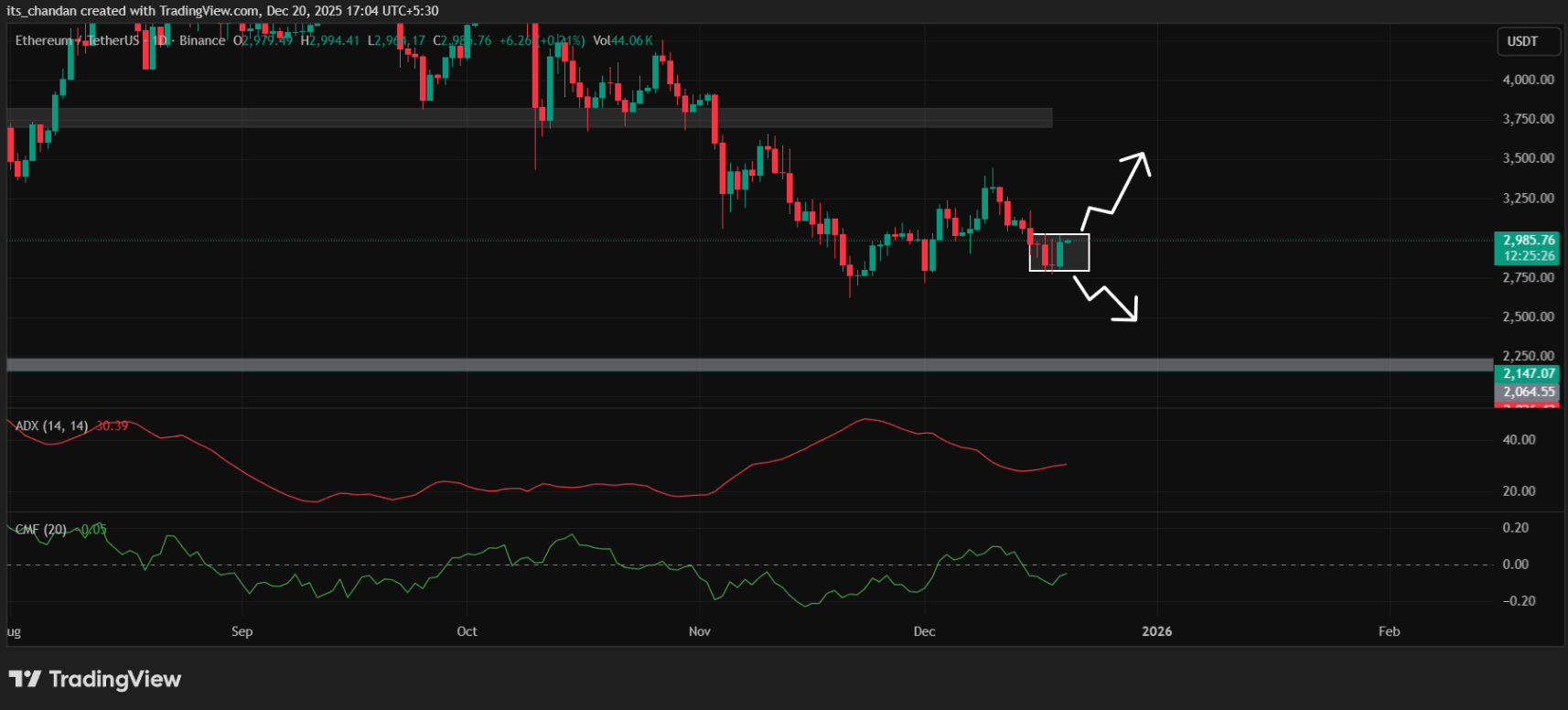 Phân tích kỹ thuật của Coin Photon trên khung thời gian ngày cho thấy ETH đang đi ngang trong một vùng tích lũy khá chặt, giới hạn giữa mốc 2.790 USD và 3.000 USD. Tuy nhiên, xét trên bức tranh tổng thể, cấu trúc thị trường vẫn nghiêng về xu hướng giảm.