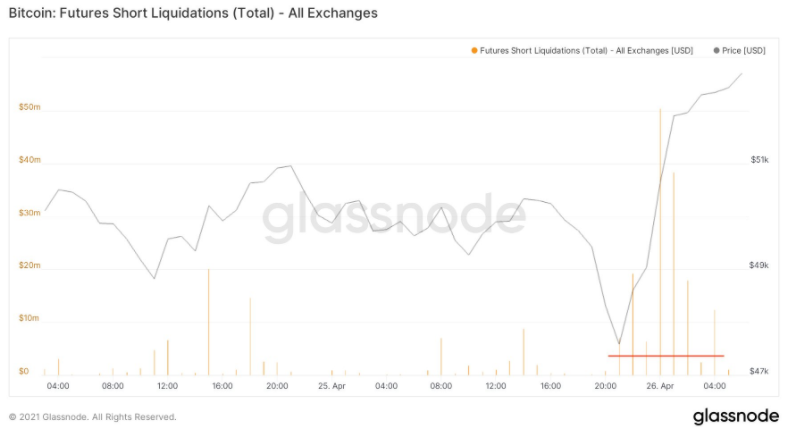 Số lượng short trị giá khoảng 150 triệu đô la đã bị thanh lý trong vòng vài giờ khi giá Bitcoin (BTC) tăng từ khoảng $ 47.000 lên hơn $ 53.000 vào ngày 26 tháng 4.