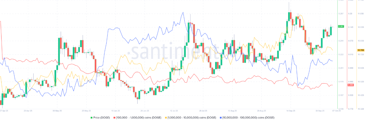 Dữ liệu Supply Distribution từ Santiment cho thấy triển vọng tích cực đối với Dogecoin. Cụ thể, hai nhóm cá voi nắm giữ từ 100.000–1 triệu DOGE (đường màu đỏ) và 10–100 triệu DOGE (đường màu xanh) đã tích lũy thêm khoảng 390 triệu token kể từ ngày 23/9.