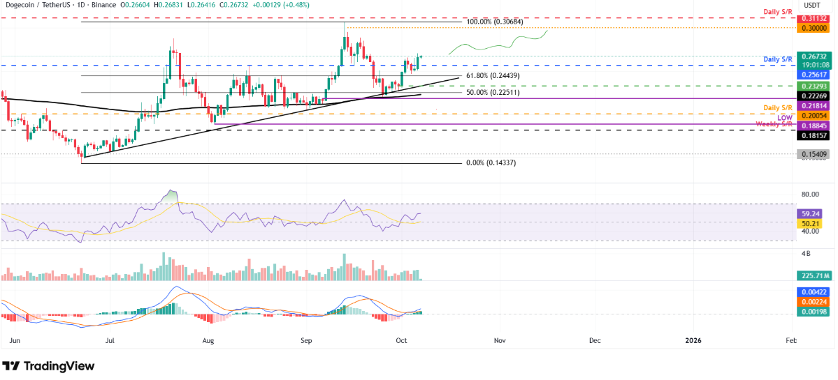 Giá Dogecoin (DOGE) đã tìm được điểm tựa vững chắc tại vùng Fibonacci thoái lui 50% quanh mốc 0,22 USD vào ngày 26/9, trước khi bật tăng gần 20% và đóng cửa trên ngưỡng kháng cự 0,25 USD vào đầu tuần này. Tính đến thời điểm viết bài ngày thứ Ba, DOGE đang giao dịch quanh 0,26 USD.