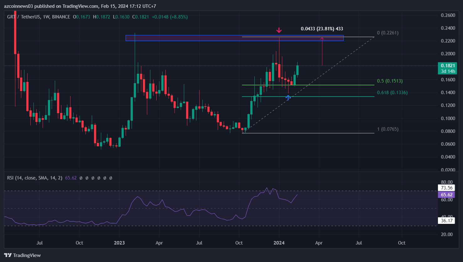 Điều này cho thấy rằng đợt điều chỉnh từ vùng kháng cự $0,23 đã kết thúc và giá GRT đang trong một đợt tăng giá khác.