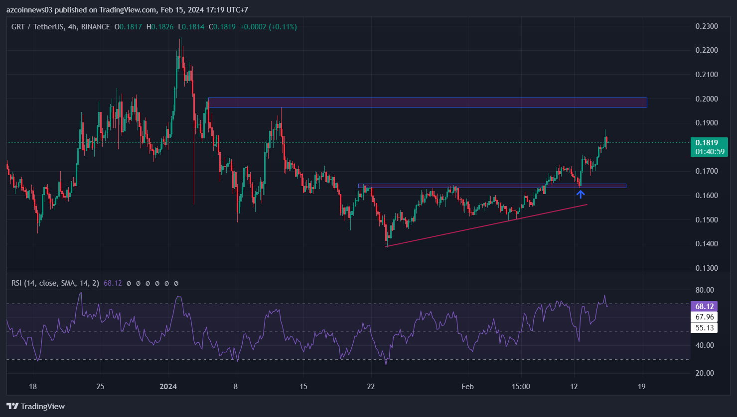 Biểu đồ 4 giờ cho thấy giá GRT đã bứt phá lên trên một tam giác tăng dần ngắn hạn và xác nhận nó làm hỗ trợ vào 12 tháng 2 (mũi tên màu xanh).