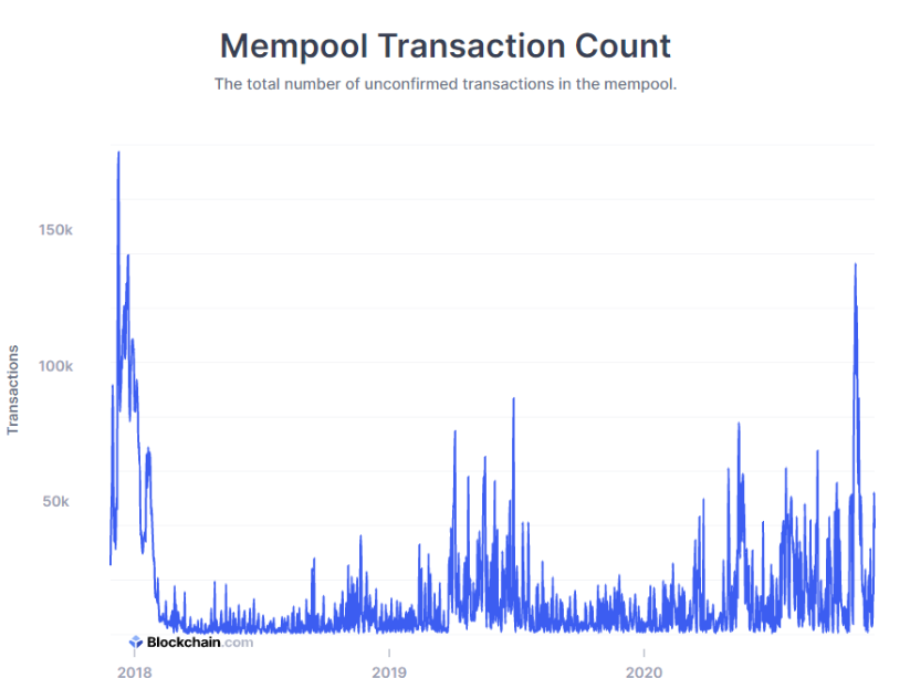 Mempool của Bitcoin, tương tự như phòng chờ giao dịch, cho thấy số lượng giao dịch chưa được xác nhận hàng ngày hiện tại là 38.900 – chỉ khoảng 20% so với số liệu năm 2017.