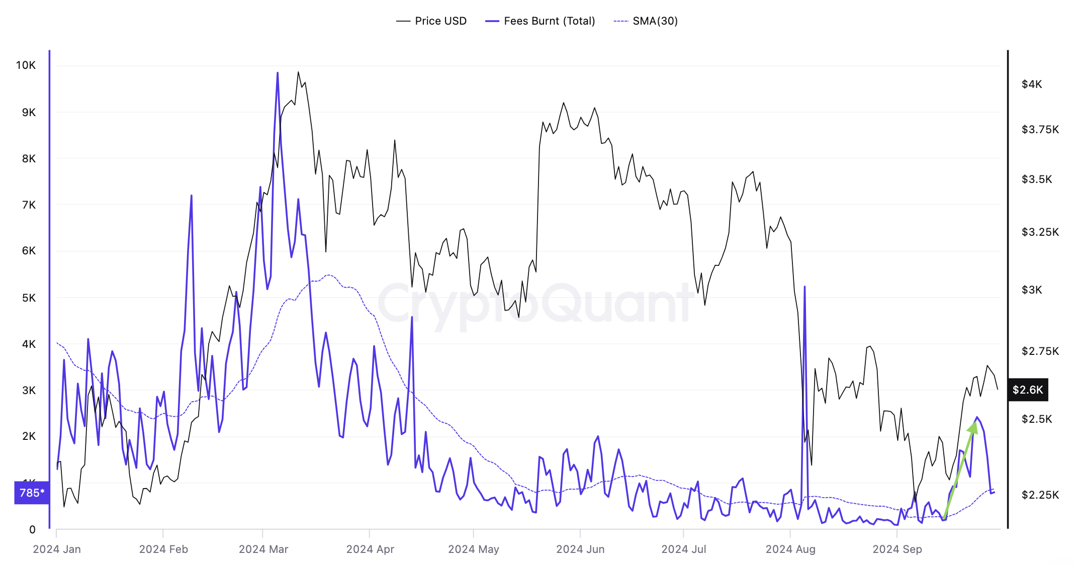 “Phí gas ETH đã tăng lên trên 30-40 gwei và sau đó giảm xuống 5-10 gwei nhiều lần trong 7 ngày qua,” Gashawk cho biết. Việc tăng cường hoạt động on-chain và phí giao dịch cũng đã dẫn đến sự gia tăng tổng số phí Ether bị đốt cháy hàng ngày, tăng hơn 900% lên 2.097 ETH từ ngày 14 đến ngày 24 tháng 9, theo dữ liệu từ CryptoQuant.