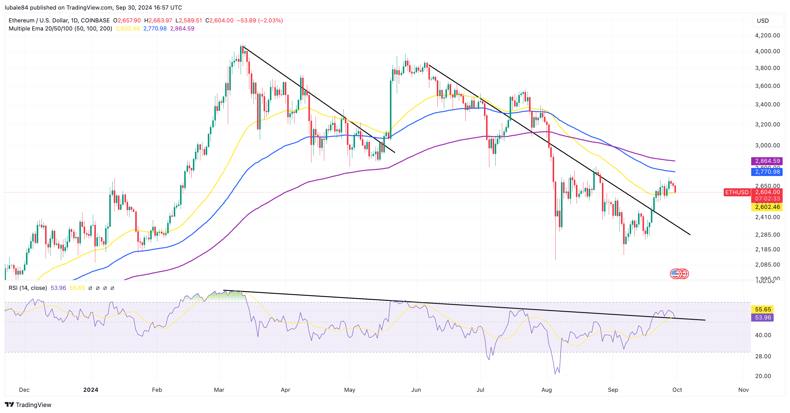 Dù đã có sự thay đổi tích cực về động lực, Ether vẫn nằm dưới các đường trung bình động hàm mũ (EMA) 100 ngày và 200 ngày, hiện tại lần lượt là $2.770 và $2.864.