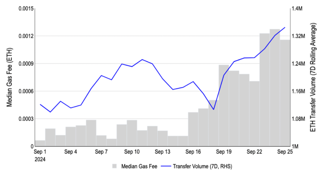 Báo cáo hàng tuần của Coinbase, được công bố vào ngày 27 tháng 9, cho biết phí gas trung bình trên Ethereum từ ngày 16 đến ngày 26 tháng 9 đã tăng 498% so với mức trung bình hàng tháng, với chi phí giao dịch trung bình tăng từ $0,09 vào đầu tháng lên $1,69.