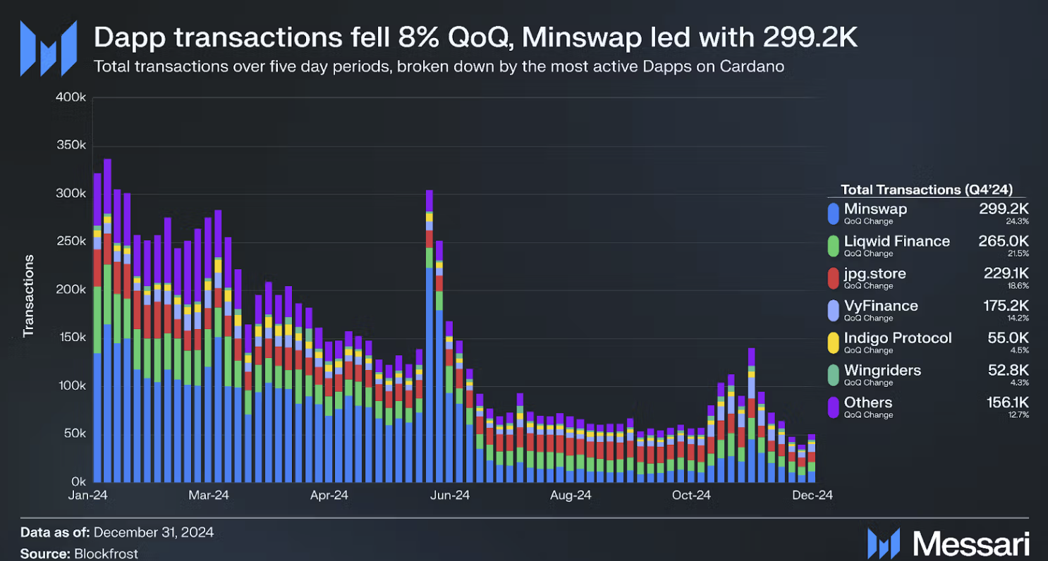 Minswap, là DEX hàng đầu của Cardano, đã thu hút hơn 200.000 trader, với tổng khối lượng giao dịch đạt 3,1 tỷ USD vào cuối quý 4. Khối lượng giao dịch DEX trung bình hàng ngày trên Cardano cũng tăng 271% theo quý, lên 8,9 triệu USD, với Minswap, WingRiders và SundaeSwap dẫn đầu. So với cùng kỳ năm trước, khối lượng giao dịch DEX đã tăng trưởng 40%.