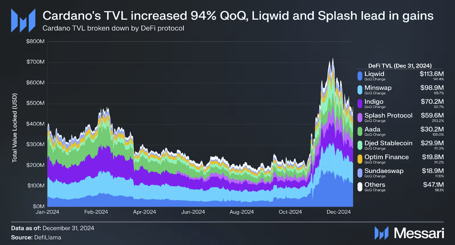 Trong khi đó, TVL của Minswap tăng 69% theo quý, lên 98,9 triệu USD. Các giao thức nhỏ hơn như Splash Protocol và Aada cũng ghi nhận mức tăng trưởng đáng kể, với TVL lần lượt tăng 253% và 105%, đạt 59,6 triệu USD và 30,2 triệu USD.