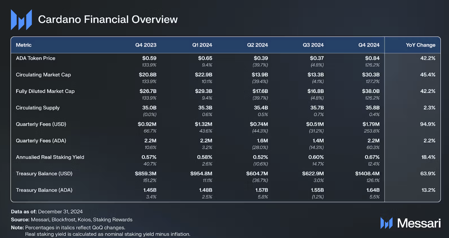 Số lượng giao dịch trung bình hàng ngày trên Cardano đã tăng 65% theo quý, đạt 71.500 giao dịch. Đồng thời, số lượng địa chỉ hoạt động trung bình hàng ngày cũng tăng trưởng 58%, lên 42.900. Phí giao dịch trung bình bằng USD tăng 80%, lên mức 0,23 USD, trong khi phí giao dịch bằng ADA giảm nhẹ 2%, còn 0,34 ADA. Messari giải thích rằng mạng lưới Cardano có khả năng xử lý khối lượng giao dịch cao mà không làm gia tăng đáng kể chi phí.