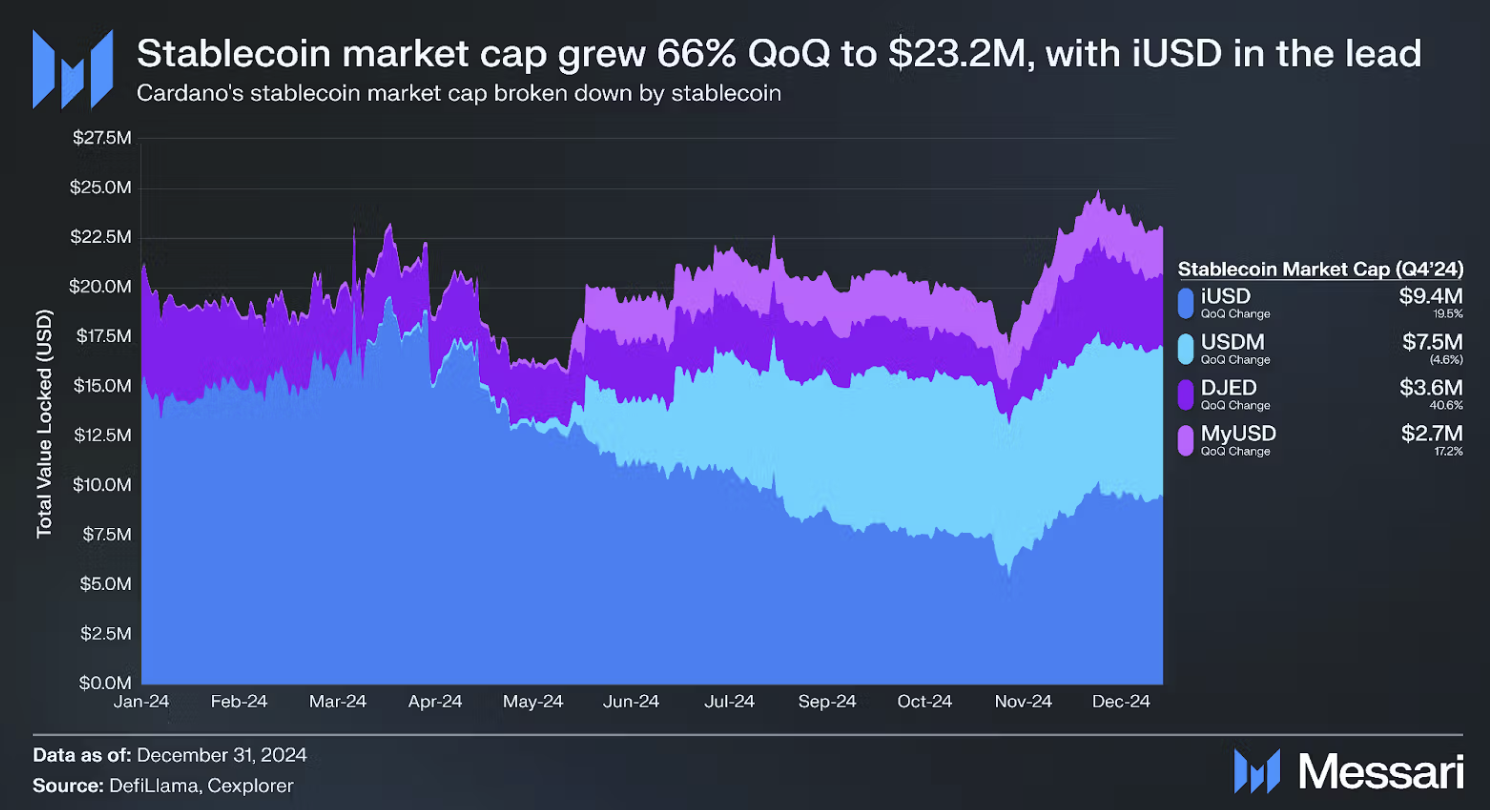 Trong quý 4, vốn hóa thị trường stablecoin của Cardano đã tăng 66% theo quý. Cụ thể, iUSD và DJED ghi nhận sự gia tăng vốn hóa thị trường lần lượt là 20% và 41% trong cùng kỳ. MyUSD cũng chứng kiến mức tăng trưởng khiêm tốn 17%, trong khi vốn hóa thị trường của USDM giảm nhẹ 5%.