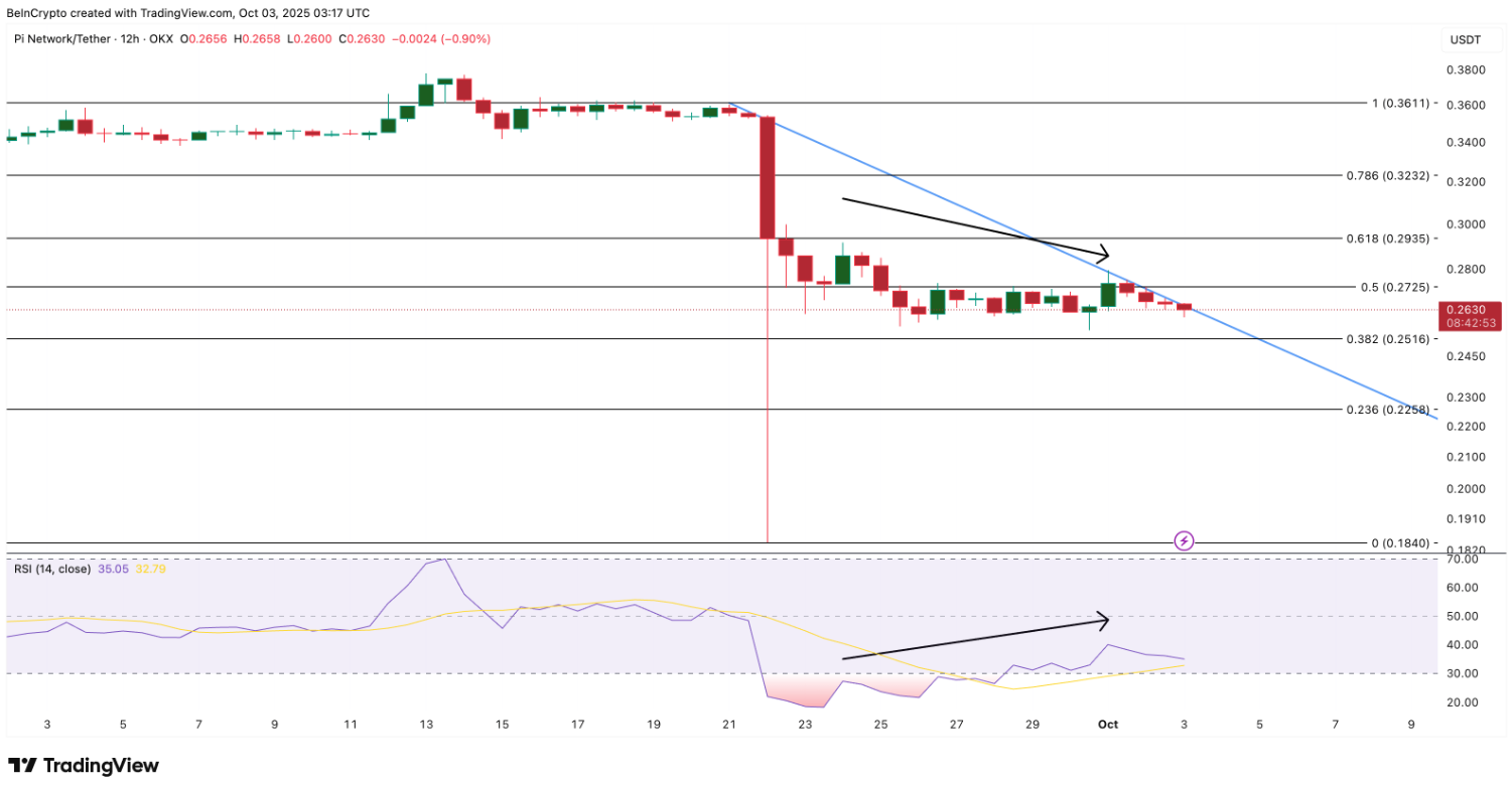 Biểu đồ khung 12 giờ đang phát đi tín hiệu đầy bất lợi cho Pi Coin. Đồng coin này di chuyển trong mô hình tam giác giảm – một cấu trúc kỹ thuật mang tính “giảm giá” đặc trưng, khi giá liên tiếp tạo các đỉnh thấp dần nhưng vẫn bám trụ tại cùng một vùng hỗ trợ. Động lượng thị trường cũng không mấy sáng sủa.