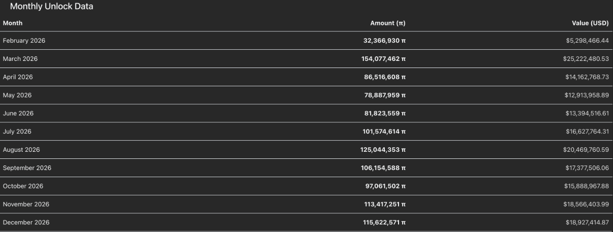 Ở chiều ngược lại, lịch mở khóa token hàng tháng tiếp tục phủ bóng lên triển vọng ngắn hạn. Cụ thể, trong tháng 2 sẽ có thêm 32,36 triệu token PI được giải phóng, và con số này dự kiến tăng mạnh lên 154,07 triệu token trong tháng 3. Nhịp mở khóa đều đặn, kéo dài này đang tạo ra áp lực cung không nhỏ, khiến nỗ lực phục hồi của Pi Network đối mặt với nhiều thách thức hơn trong bối cảnh thị trường chưa thực sự ổn định.