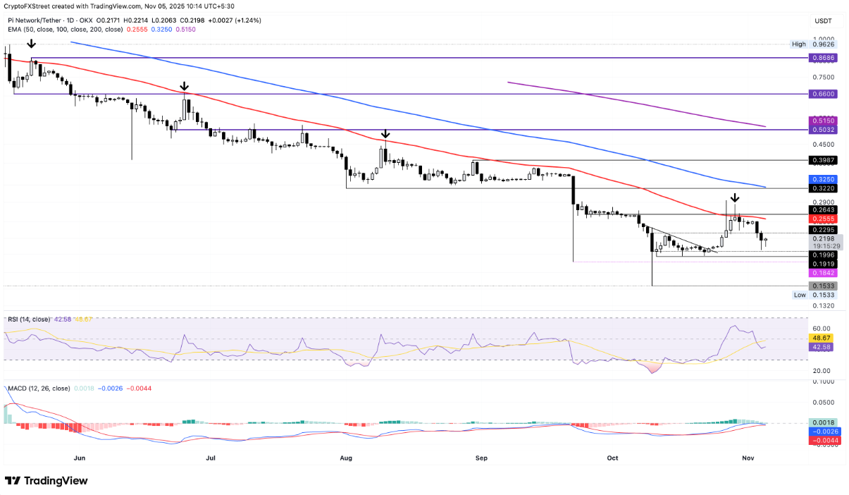 Vào thời điểm viết bài hôm thứ Tư, Pi Network (PI) ghi nhận mức tăng nhẹ hơn 2%, bật lên từ ngưỡng thấp 0,2063 USD đầu ngày. Đợt hồi phục trong phiên này hướng về đường trung bình dộng hàm mũ (EMA) 50 ngày tại 0,2555 USD – mức kháng cự động đã chặn đà phục hồi của PI lần thứ tư trong tuần trước.
