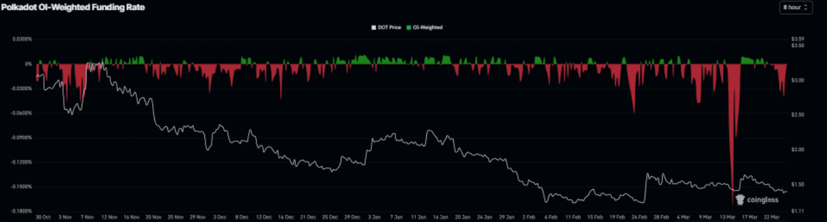 Dữ liệu funding rate từ CoinGlass cho thấy tâm lý bi quan đang bao trùm Polkadot. Chỉ số này đã đảo chiều sang vùng âm từ thứ Bảy và tiếp tục lao dốc xuống -0,019% vào thứ Tư, cho thấy phe short sẵn sàng trả phí để duy trì vị thế — tín hiệu phản ánh kỳ vọng giá DOT còn suy yếu trong ngắn hạn.