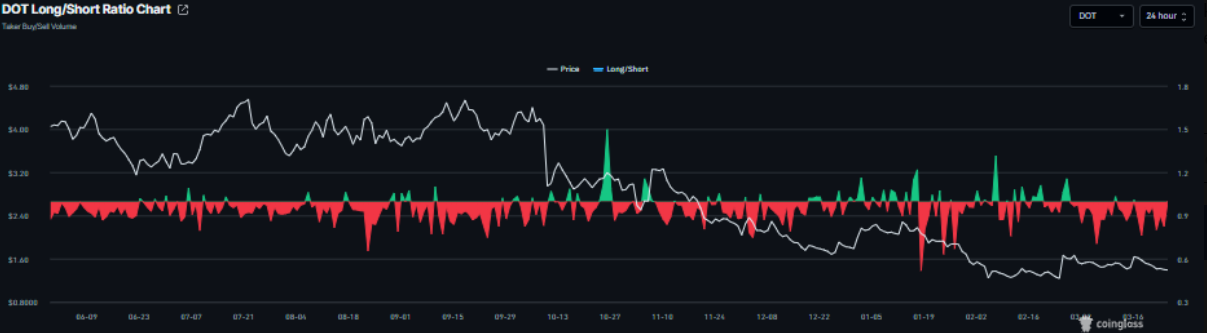 Bên cạnh đó, tỷ lệ long/short của DOT trên CoinGlass hiện chỉ đạt 0,82, củng cố thêm xu hướng giảm khi phần lớn trader đang nghiêng về kịch bản giá tiếp tục đi xuống.