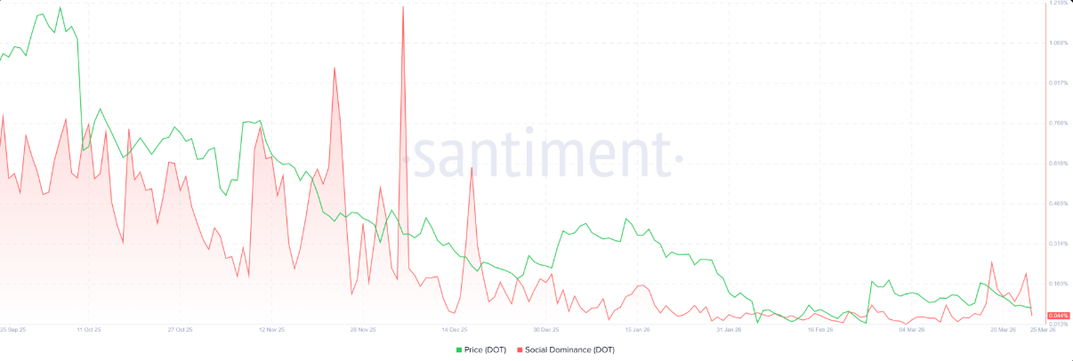 Chỉ số Social Dominance của Santiment tiếp tục củng cố kịch bản tiêu cực. Đây là thước đo tỷ trọng thảo luận về DOT trên các kênh truyền thông crypto, và kể từ giữa tháng 3, chỉ số này đã giảm liên tục, hiện chỉ còn 0,044%. Diễn biến này cho thấy mức độ quan tâm cũng như tâm lý của nhà đầu tư đang suy yếu rõ rệt.