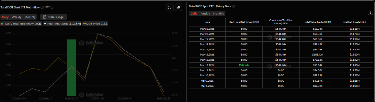Ở góc độ tổ chức, lực cầu vẫn mờ nhạt. Polkadot ETF giao ngay đầu tiên do 21Shares phát hành chưa ghi nhận thêm dòng vốn sau khoản đầu tư ban đầu 544.490 USD vào ngày 12/3, phản ánh sự thận trọng và thiếu mặn mà từ khối nhà đầu tư tổ chức.