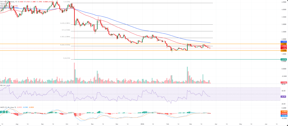 Giá DOT tiếp tục suy yếu và trượt xuống dưới mốc 1,40 USD trong phiên thứ Tư, cho thấy xu hướng ngắn hạn vẫn nghiêng về giảm. Áp lực bán duy trì khi giá nằm dưới các đường EMA 50 ngày và 100 ngày (lần lượt quanh 1,53 USD và 1,75 USD), với cả hai đường trung bình đều dốc xuống và đóng vai trò là vùng kháng cự động.