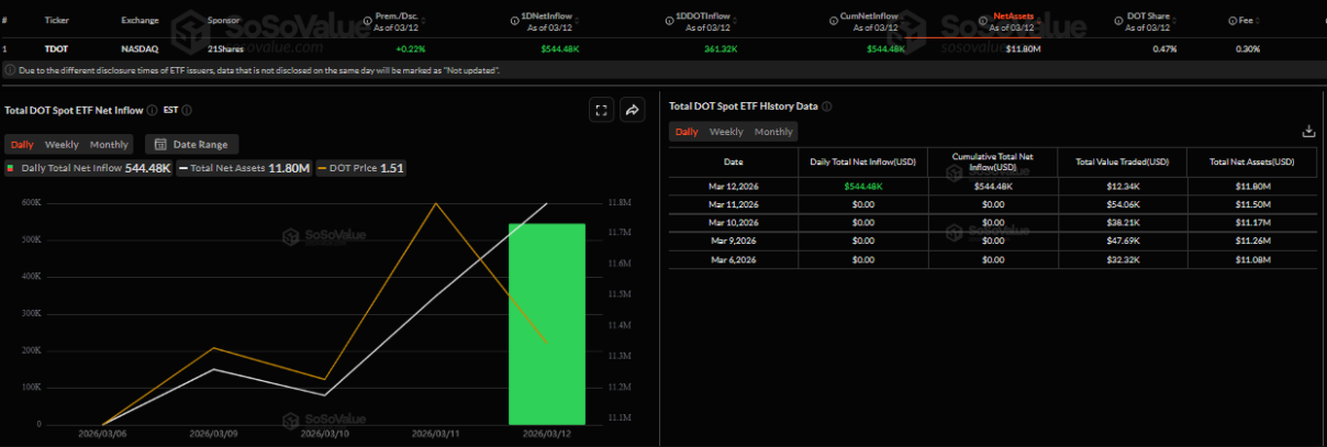 Theo dữ liệu từ SoSoValue, quỹ DOT ETF giao ngay này đã ghi nhận dòng vốn ròng dương đầu tiên trị giá 544.480 USD vào thứ Năm, cho thấy tín hiệu quan tâm ban đầu từ các nhà đầu tư tổ chức. Nếu xu hướng dòng tiền tiếp tục được duy trì và mở rộng, nhu cầu gia tăng có thể trở thành chất xúc tác giúp giá DOT bước vào một chu kỳ tăng trưởng mới trong thời gian tới.