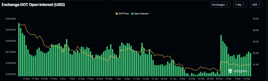 Trên thị trường phái sinh, dữ liệu từ CoinGlass cho thấy hợp đồng mở (OI) của hợp đồng tương lai Polkadot trên các sàn đã tăng vọt lên 256,76 triệu USD vào ngày 26/2 — mức cao nhất kể từ ngày 10/11 — trước khi hạ nhiệt và ổn định quanh 207,60 triệu USD vào thứ Sáu. Sự gia tăng của OI thường phản ánh dòng vốn mới đang chảy vào thị trường cùng với hoạt động mở vị thế mạnh hơn, yếu tố có thể tiếp thêm động lực cho đà tăng của DOT.