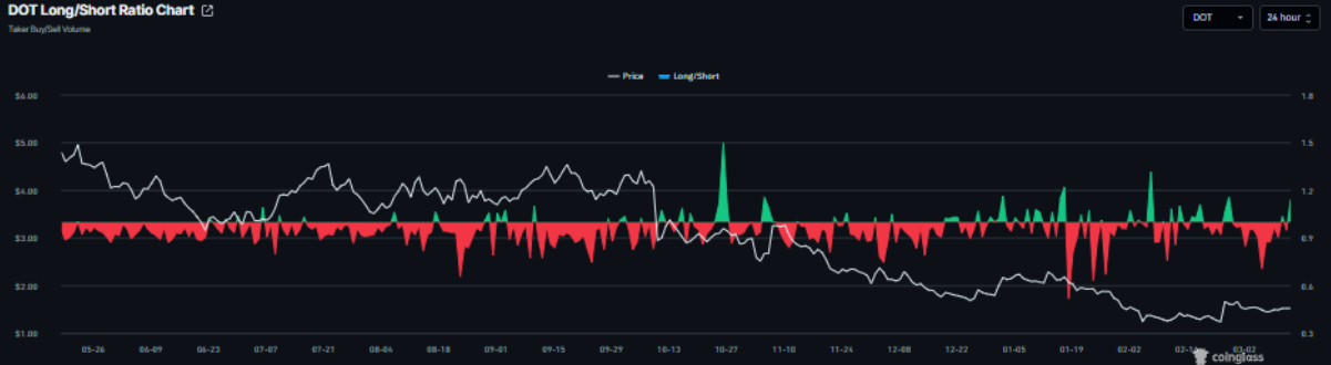 Không chỉ vậy, tỷ lệ long/short của DOT theo CoinGlass đạt 1,14 vào thứ Sáu, đồng nghĩa số trader đặt cược vào khả năng giá Polkadot tiếp tục đi lên đang chiếm ưu thế so với những người kỳ vọng giá giảm.