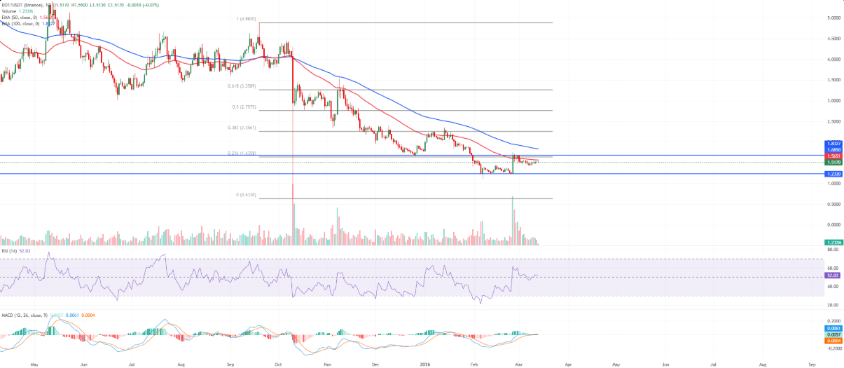Trong trường hợp giá đóng cửa ngày dưới 1,23 USD, triển vọng tích cực hiện tại có thể suy yếu đáng kể và làm gia tăng rủi ro cho một nhịp điều chỉnh sâu hơn trong bối cảnh xu hướng giảm dài hạn vẫn chưa hoàn toàn kết thúc. Ngược lại, nếu Polkadot tiếp tục duy trì giao dịch ổn định trên vùng 1,52 USD, thị trường nhiều khả năng sẽ hướng sự chú ý tới khả năng kiểm tra lại vùng kháng cự quan trọng tại 1,68 USD.