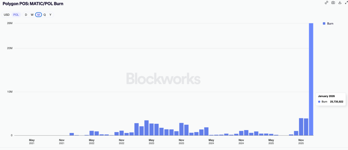 Ở một diễn biến khác, dữ liệu từ Blockworks cho thấy 25,73 triệu token POL đã được loại khỏi lưu thông trong tháng 1. Việc nguồn cung lưu hành suy giảm thường được xem là yếu tố hỗ trợ tích cực cho cán cân cung – cầu, qua đó có thể góp phần thúc đẩy nhu cầu đối với token này.