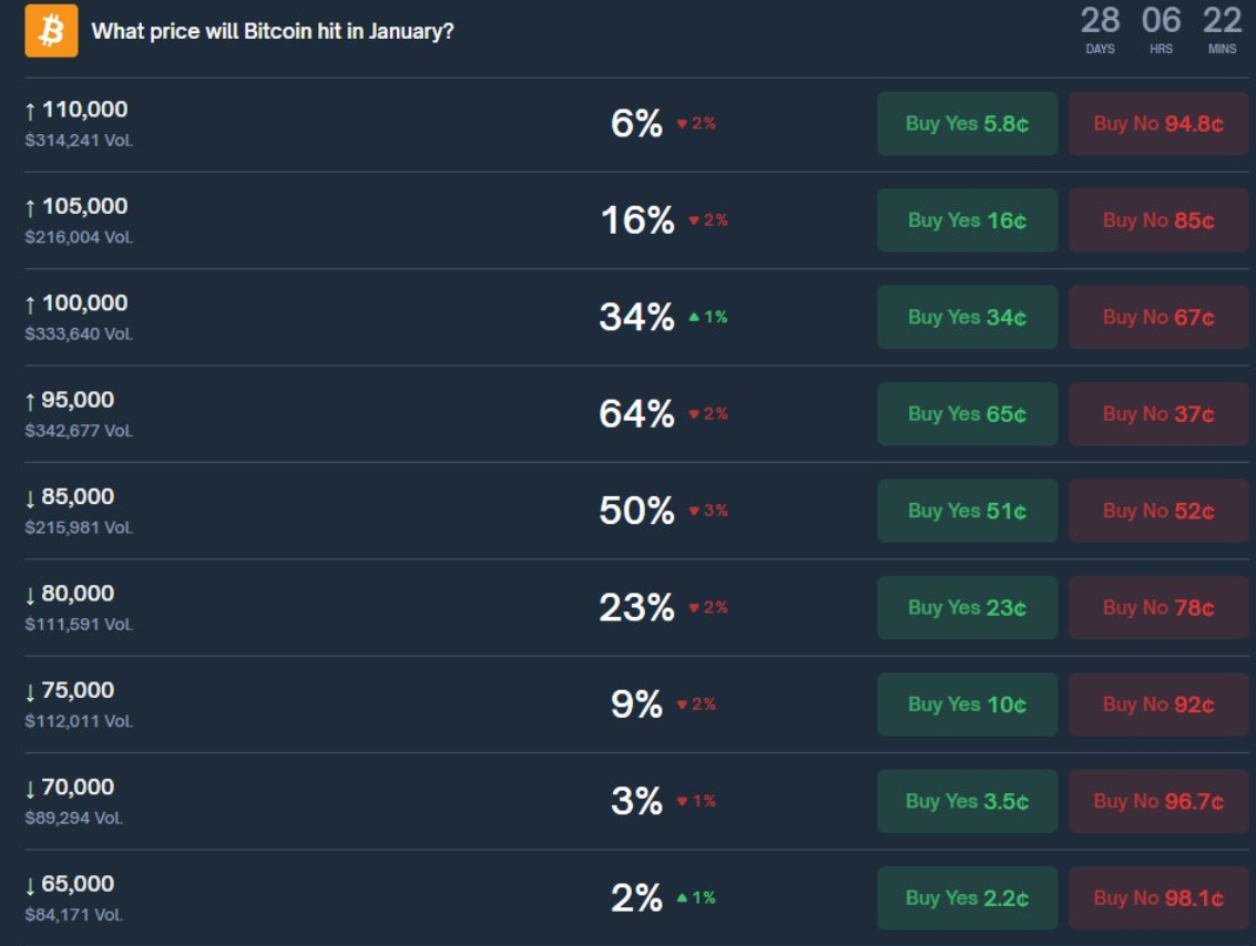Các thị trường dự đoán đang cho thấy triển vọng tương đối lạc quan đối với Bitcoin trong giai đoạn đầu năm. Theo Polymarket, nhà giao dịch đang định giá xác suất 34% rằng Bitcoin có thể chạm mốc 100.000 USD trong tháng 1. Trong khi đó, khả năng Bitcoin quay trở lại vùng 80.000 USD chỉ ở mức 23%. Sự chênh lệch này cho thấy thị trường hiện đánh giá kịch bản tăng giá có xác suất cao hơn so với một nhịp điều chỉnh mạnh trong ngắn hạn.
