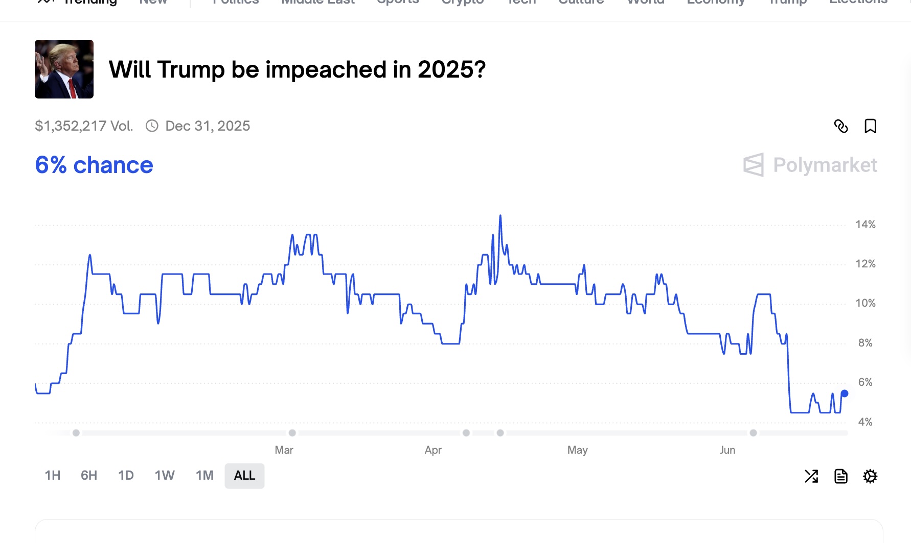 Dữ liệu từ Polymarket cho thấy khả năng Tổng thống Donald Trump bị luận tội trước cuối năm 2025 vẫn rất thấp, dù có động thái chính thức từ Hạ viện Mỹ. Hiện tỷ lệ cược chỉ là 6%, tăng nhẹ từ mức 5% đầu tuần, với khối lượng giao dịch vượt 1,3 triệu USD.