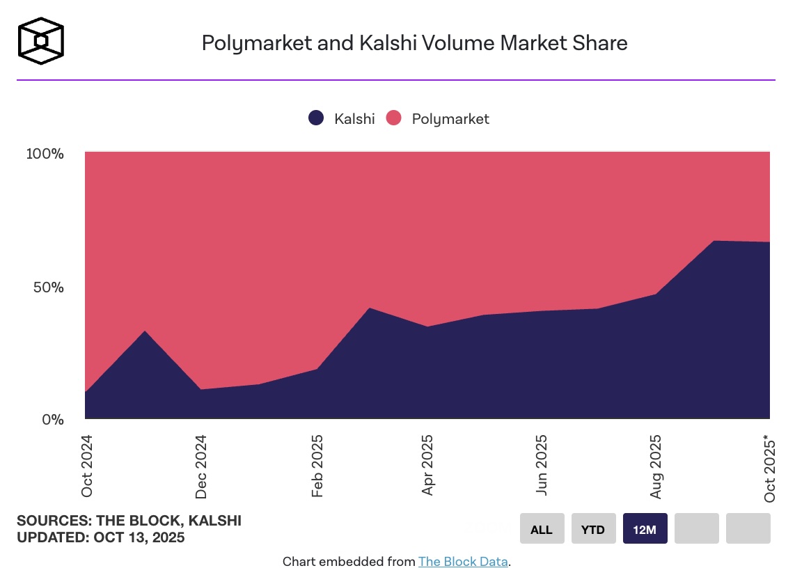 Tháng 9, Kalshi chiếm tới 60% thị phần, đảo ngược xu hướng đầu năm khi Polymarket từng dẫn đầu. Khối lượng tăng mạnh được cho là nhờ quan hệ hợp tác giữa Kalshi và Robinhood, cho phép người dùng cá cược thể thao trực tiếp trên nền tảng Robinhood.
