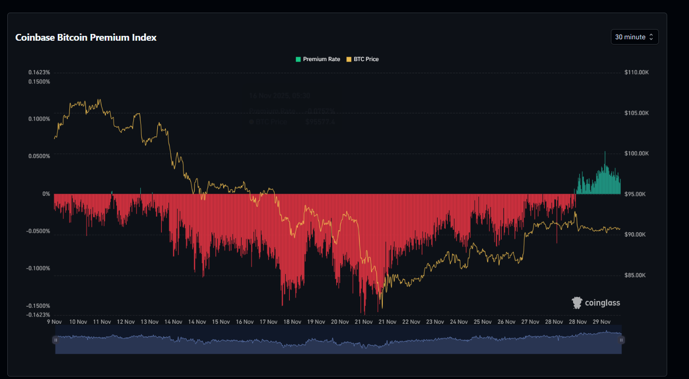 Theo dữ liệu từ Coinglass, Chỉ số Premium Bitcoin trên sàn Coinbase đã quay trở lại vùng dương sau gần một tháng liên tục ở mức âm. Diễn biến này mang ý nghĩa tích cực, bởi chỉ số Premium thường phản ánh sự chênh lệch giá BTC trên Coinbase so với các sàn giao dịch toàn cầu, qua đó cho thấy mức độ quan tâm của nhà đầu tư Mỹ.