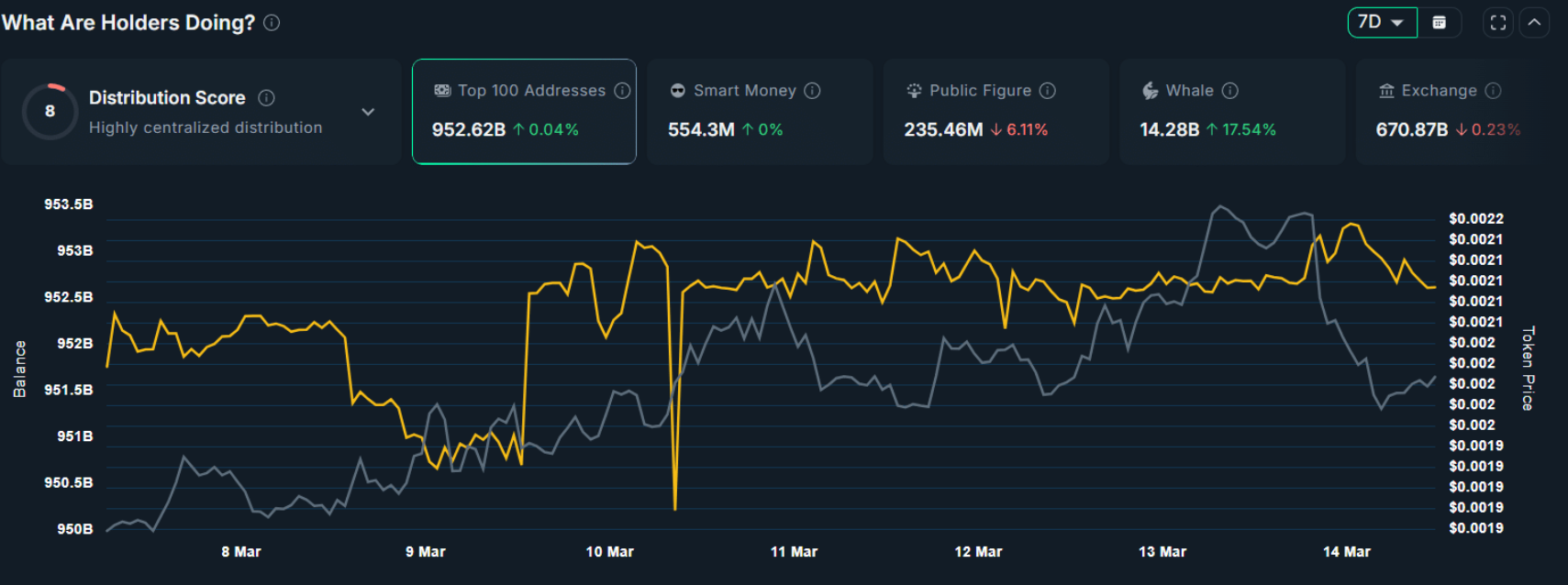 Dữ liệu từ nền tảng phân tích Nansen cũng cho thấy sự dịch chuyển đáng chú ý trong cơ cấu nắm giữ. Trong bối cảnh thị trường còn nhiều bất định, nhà đầu tư nhỏ lẻ đã giảm lượng nắm giữ khoảng 235,46 triệu PUMP, tương đương 6,11%. Trái lại, nhóm cá voi lại tăng thêm 14,27 tỷ PUMP, tương đương 18,23% chỉ trong vòng bảy ngày.