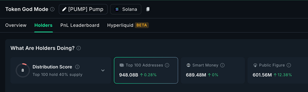 Theo dữ liệu từ Nansen, 100 địa chỉ ví lớn nhất hiện nắm giữ 948,08 tỷ PUMP, tăng thêm 0,28% chỉ trong 24 giờ qua. Đáng chú ý hơn, các ví công khai — thường gắn liền với những trader kỳ cựu, KOL và nhà sáng lập có tiếng trong thị trường đã tăng lượng nắm giữ lên đến 12,38%, sở hữu tổng cộng 601,56 triệu token.