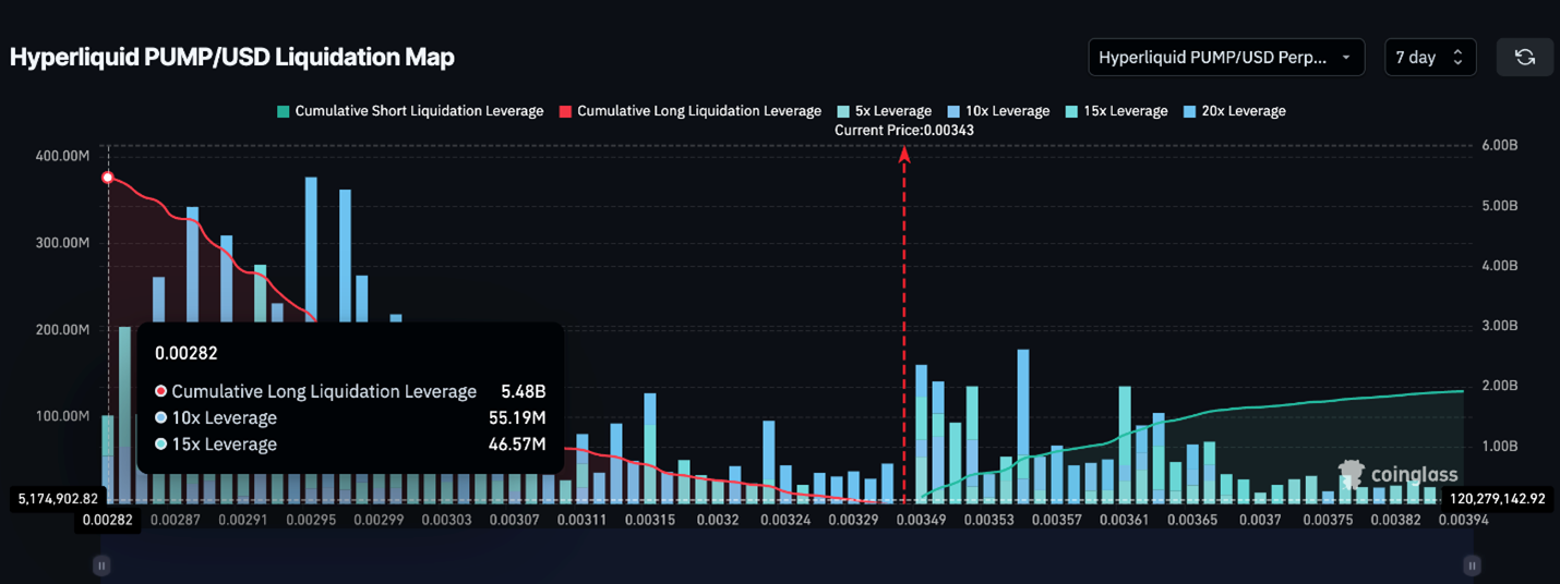 Bản đồ thanh lý từ Hyperliquid cũng ủng hộ triển vọng tăng giá. Với mức giá hiện tại là 0,0034 đô la, PUMP đang tiến gần đến một cụm dày đặc các vị thế Short.