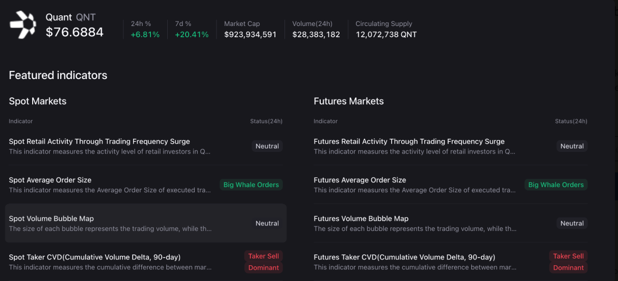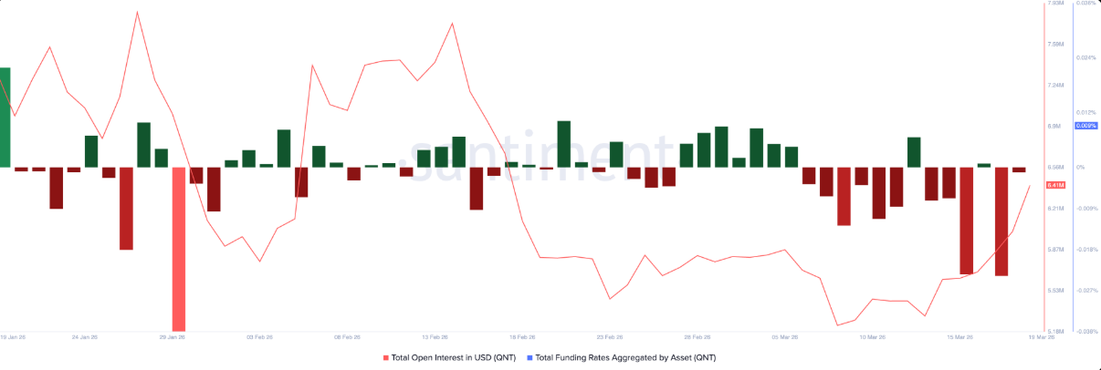 Ở thị trường phái sinh, hợp đồng mở (OI) của hợp đồng futures QNT nhích lên 6,41 triệu USD từ mức 6,02 triệu USD trong ngày thứ Tư. Đồng thời, funding rate cải thiện từ -0,0163% lên -0,004%, cho thấy áp lực bán từ phe gấu đang dần suy yếu.