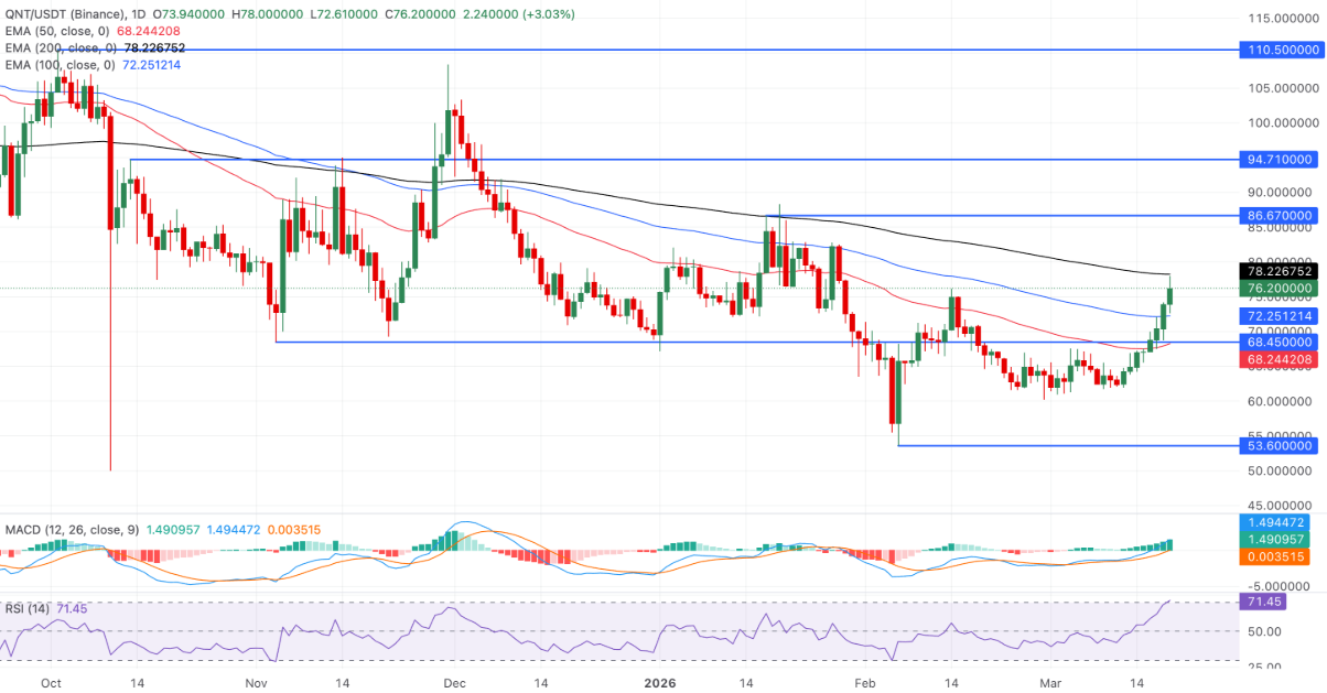 Đà tăng của Quant vẫn được duy trì khi giá bám trên các đường EMA 50 ngày và 100 ngày, tuy nhiên đang vấp phải lực cản đáng kể tại EMA 200 ngày quanh mốc 78,22 USD — tín hiệu cho thấy đây có thể chỉ là nhịp phục hồi sớm trong một xu hướng giảm lớn hơn.