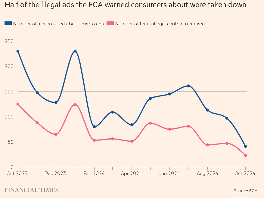 Theo báo cáo từ Financial Times, trong số 1.702 cảnh báo mà Cơ quan Quản lý Tài chính (FCA) Vương quốc Anh đưa ra từ tháng 10 năm 2023 đến tháng 10 năm 2024, có đến 54% dẫn đến việc gỡ bỏ các quảng cáo tiền điện tử vi phạm. Tuy nhiên, báo cáo cũng chỉ ra rằng các chương trình quảng bá liên quan đến tiền điện tử vẫn tiếp tục tồn tại, cho thấy vấn đề này vẫn chưa được giải quyết triệt để.