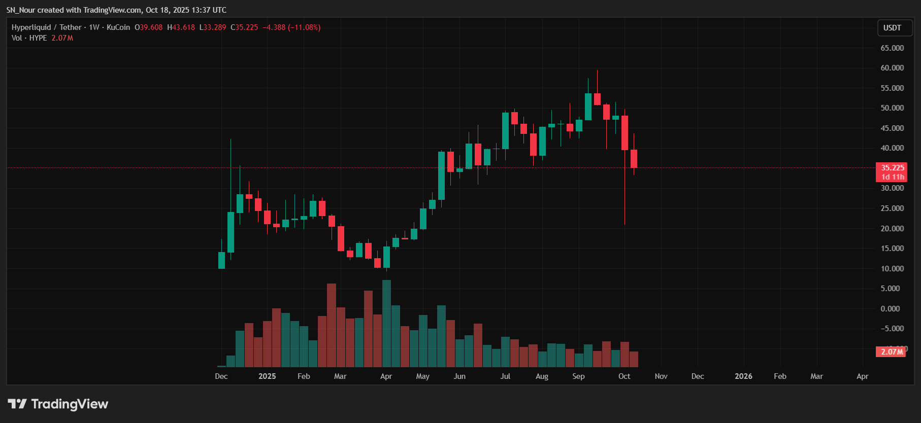 Tại thời điểm viết bài, Hyperliquid (HYPE) được giao dịch ở mức 35,25 USD, giảm 10,87% trong 7 ngày qua, phản ánh rõ nét sự suy yếu cùng với thị trường chung.