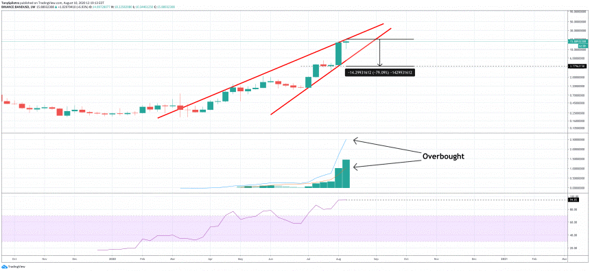 Trên khung thời gian hàng tuần, BAND đang giao dịch trong nêm tăng dần thậm chí còn lớn hơn và các chỉ báo cho thấy câu chuyện tương tự về điều kiện mua quá mức.