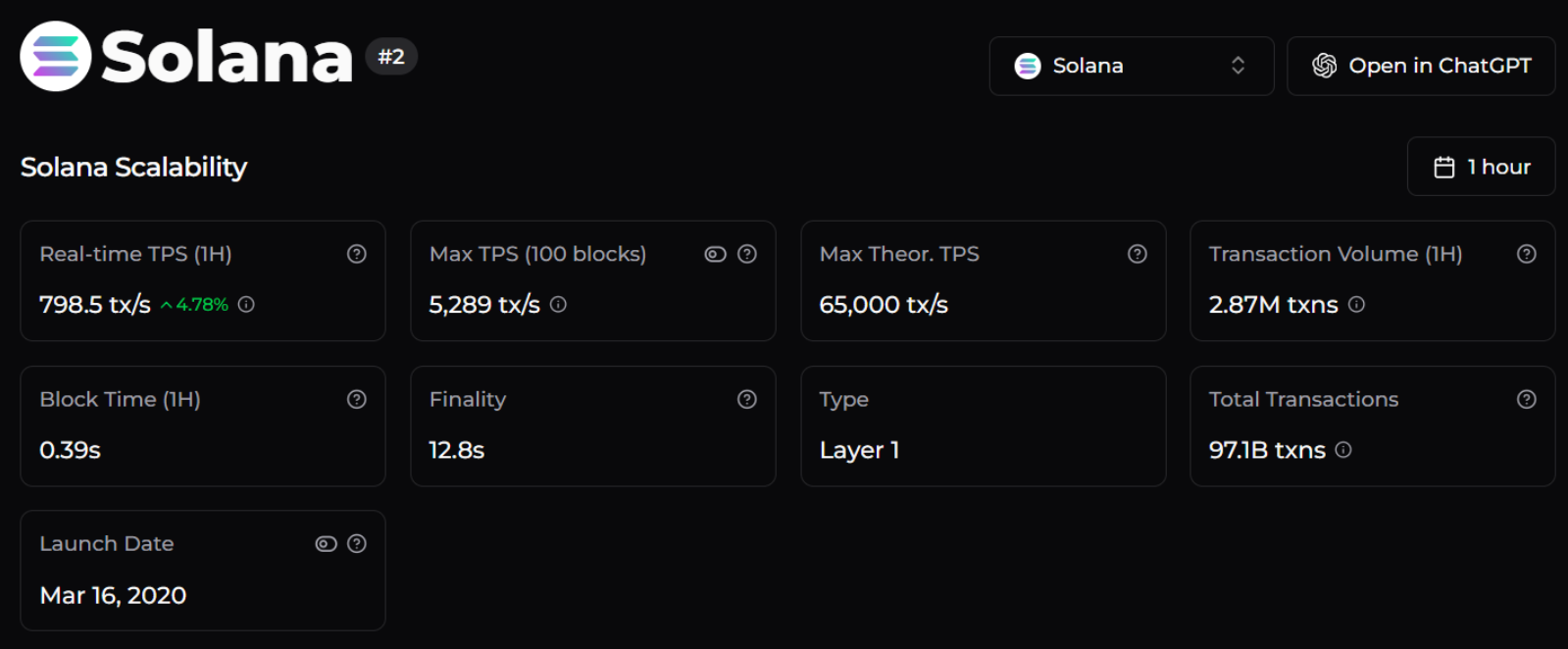 Theo Chainspect, khả năng mở rộng của mạng Solana đang cho thấy những cải thiện ấn tượng, với thông lượng giao dịch theo thời gian thực (TPS) tăng 4,78% trong khung 1 giờ, đạt 798,5 giao dịch/giây, trong khi thời gian hoàn tất giao dịch duy trì ở mức 12,8 giây. Những con số này đưa Solana vào nhóm các blockchain vốn hóa lớn sở hữu hiệu suất vận hành cao hàng đầu thị trường.