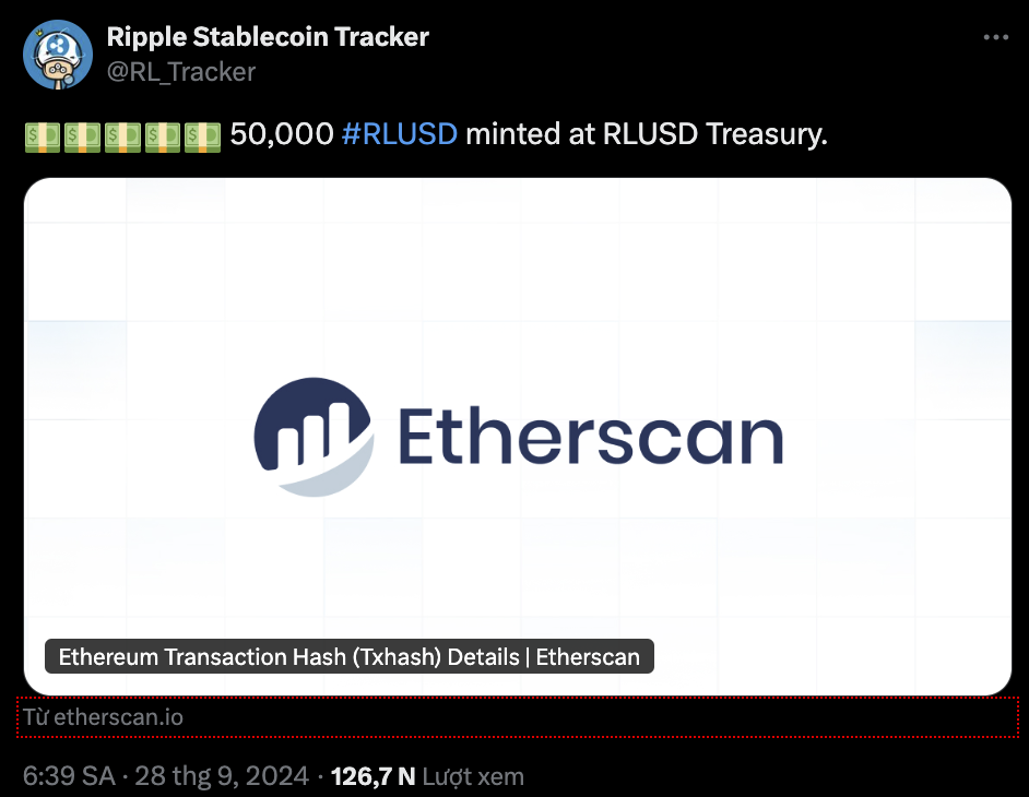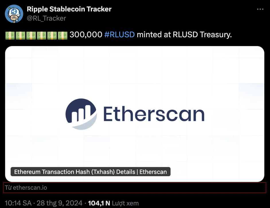 Trong một động thái mang tính đột phá, Ripple đã đúc 350.000 stablecoin RLUSD trong vòng 24 giờ, được thực hiện qua hai giao dịch: 300.000 RLUSD và 50.000 RLUSD, theo báo cáo từ tài khoản X Ripple stablecoin tracker chuyên theo dõi hoạt động đúc và giao dịch RLUSD.