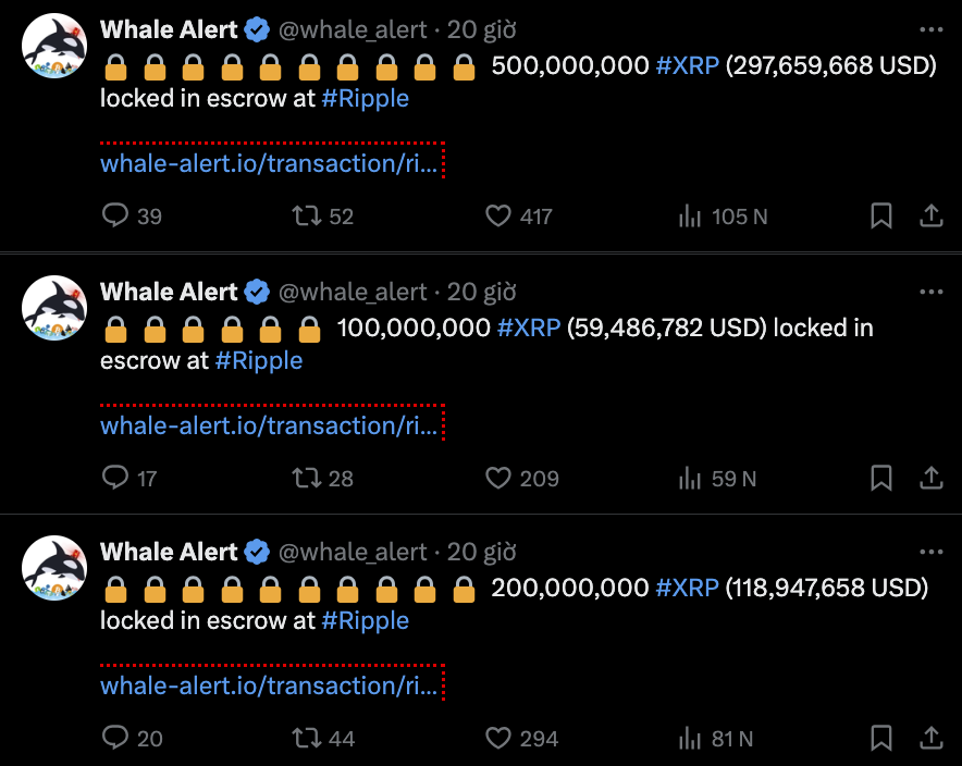 Theo một loạt tweet gần đây từ công cụ theo dõi tiền điện tử nổi tiếng Whale Alert, gã khổng lồ Ripple đã thực hiện các giao dịch chuyển XRP lớn sang ví escrow, hay có thể hiểu là khóa các khoản tiền đó.