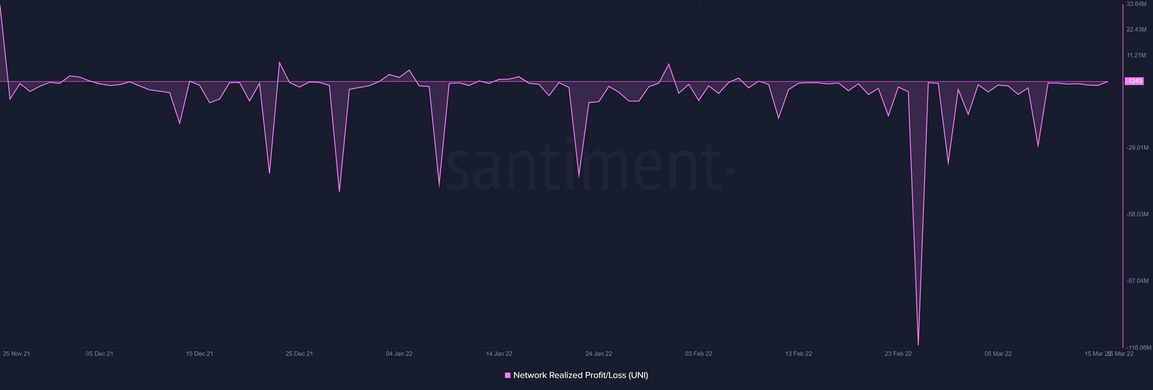 Tuy nhiên, niềm tin không chỉ mới gia tăng gần đây. Kể từ cuối tháng 2, các nhà đầu tư mua vào khoảng 600k UNI trị giá 5,2 triệu đô la. Bây giờ, họ dường như đang ở trong khu vực có thể bắt đầu chốt lời. Do đó, tỷ lệ UNI đổi chủ cũng gia tăng.
