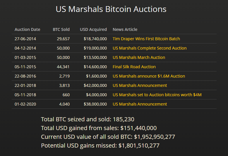 Ngay cả chính phủ Hoa Kỳ thường bán bớt tiền điện tử bị tịch thu trong các cuộc đấu giá do Cảnh sát Tư pháp Hoa Kỳ thực hiện. Đầu năm nay, cơ quan liên bang Hoa Kỳ đã tiết lộ việc bán đấu giá 4.041.58424932 Bitcoin với giá 38 triệu đô la vào tháng 2 năm nay, khi vào thời điểm đó đồng tiền này vẫn được định giá dưới 9,200 đô la.