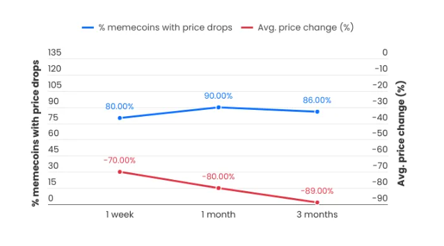 Nghiên cứu cũng chỉ ra rằng 97% memecoin thất bại, với chỉ 15 trên tổng số 1,7 triệu token có thể tồn tại lâu dài. Con số này cho thấy mức độ rủi ro cực lớn của những tài sản đầu cơ này. Cùng với đó, một nghiên cứu khác cũng tiết lộ rằng 76% memecoin do những người có tầm ảnh hưởng quảng bá thường mất hơn 90% giá trị chỉ trong vòng ba tháng, khiến các nhà đầu tư chịu lỗ nặng.