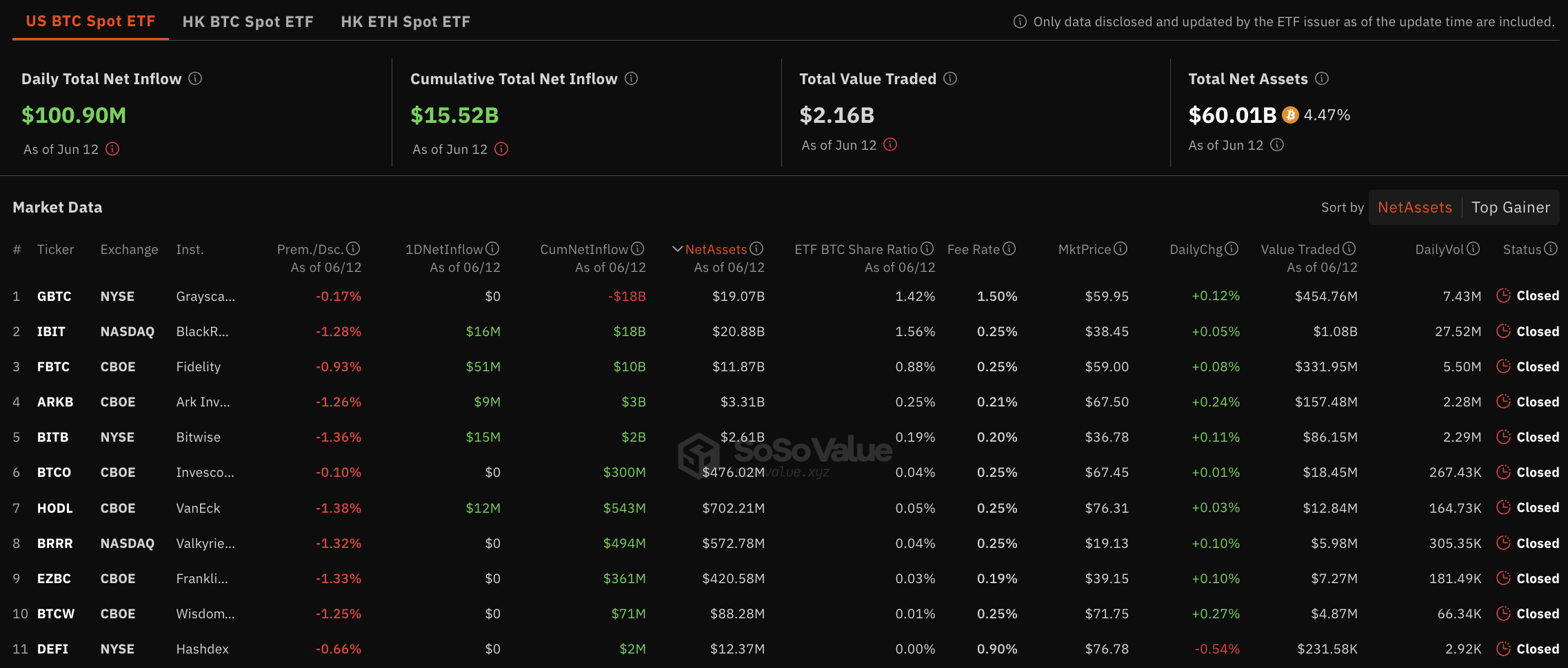 11 quỹ Bitcoin ETF giao ngay của Hoa Kỳ tiếp tục thu hút 100,9 triệu USD sau hai ngày bị thoái vốn, chấm dứt chuỗi dòng vốn vào kỷ lục kéo dài 19 ngày.
