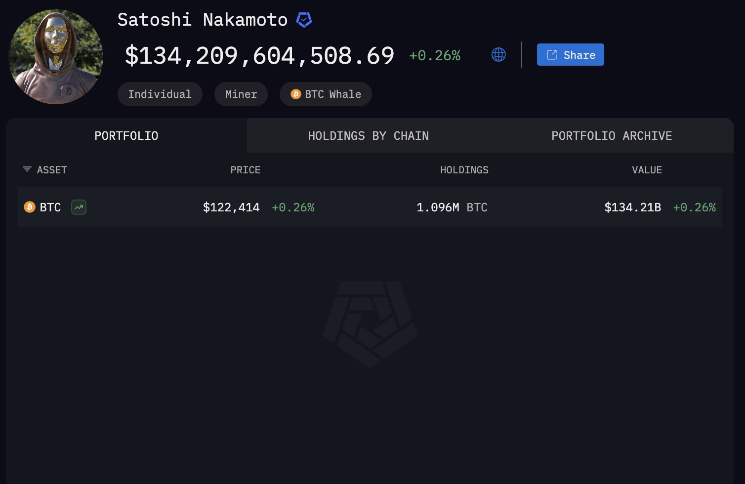 Satoshi Nakamoto, người sáng lập ẩn danh của Bitcoin, hiện nắm giữ 1,096 triệu BTC, trị giá khoảng 134,209 tỷ USD theo giá 122.414 USD/BTC.